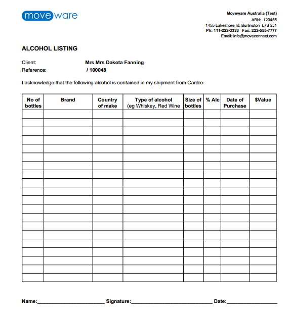 Report listing any Alcohol contained in shipment