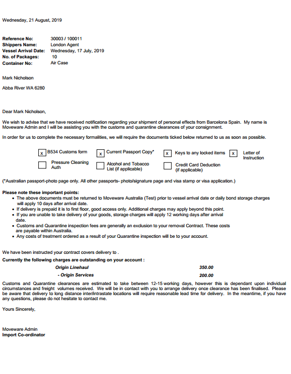 Letter notifying client of incoming shipment detailing requested documents, bond storage charges and any payment required.
