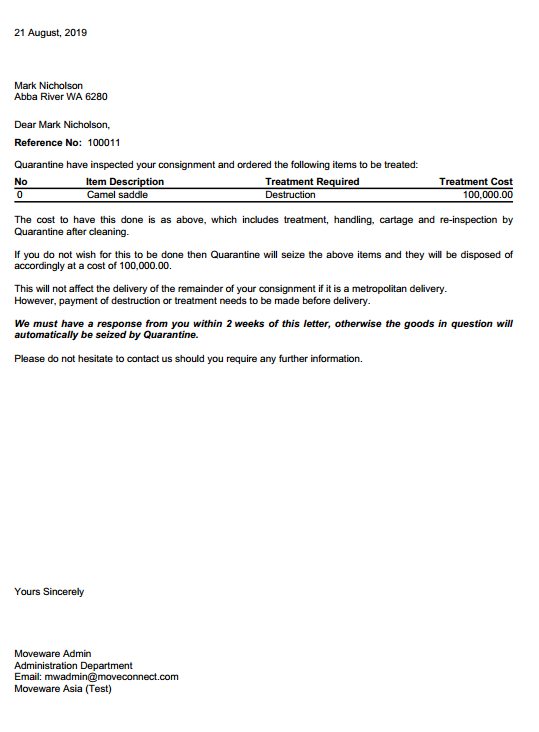Notification to client confirming Storage and associated invoice charges.