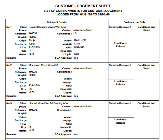 Customs Lodgement Sheet