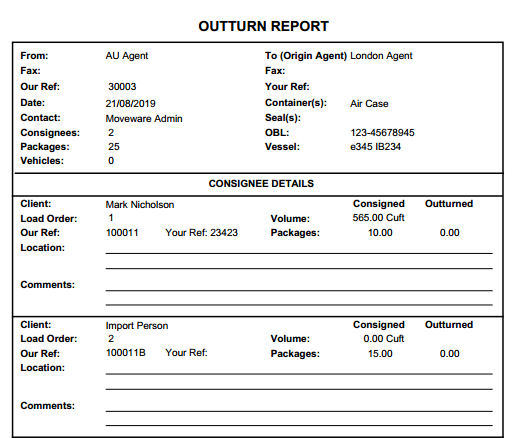 Report listing number of actual items and volume outturned against those consigned